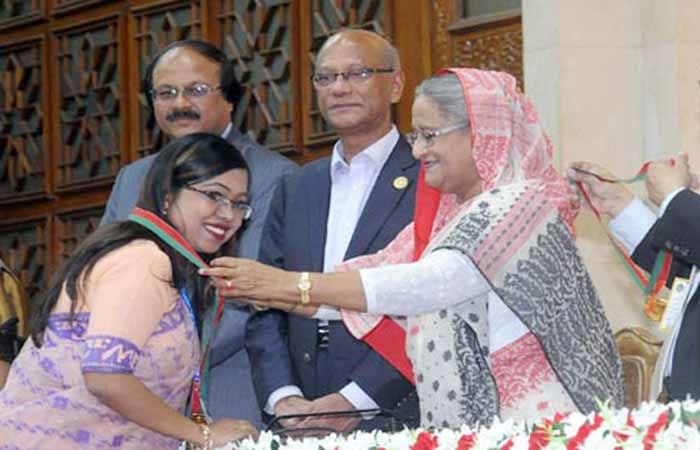কিশোরবাংলাপ্রতিবেদন: প্রধানমন্ত্রী শেখ হাসিনার হাত থেকে স্বর্ণপদক নিয়েছেন দেশের বিশ্ববিদ্যালয়গুলোর ২৬৫ জন মেধাবী ও কৃতি শিক্ষার্থী। নিজ কার্যালয়ে রোরবার সকালে বিশ্ববিদ্যালয় মঞ্জুরী কমিশনের ‘প্রধানমন্ত্রী স্বর্ণপদক-২০১৫ ও ২০১৬’ বিতরণ করেন শেখ হাসিনা।