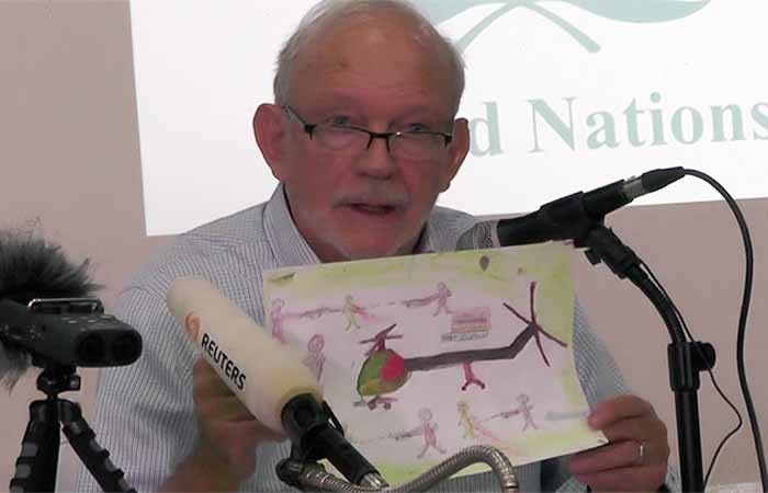 সংবাদ সম্মেলনে লেইক একটি ছবি তুলে ধরেন। সেখানেই দেখা যায়, বিমান ও হেলিকপ্টার থেকে গুলি করা হচ্ছে। তিনি বলেন, আমি শিশুটিকে প্রশ্ন করলাম, ‘দুজন মানুষকে দেখা যাচ্ছে বাড়িগুলোর কাছে। এরা কোথায়? ও বলল, তাদের মেরে ফেলা হয়েছে।’